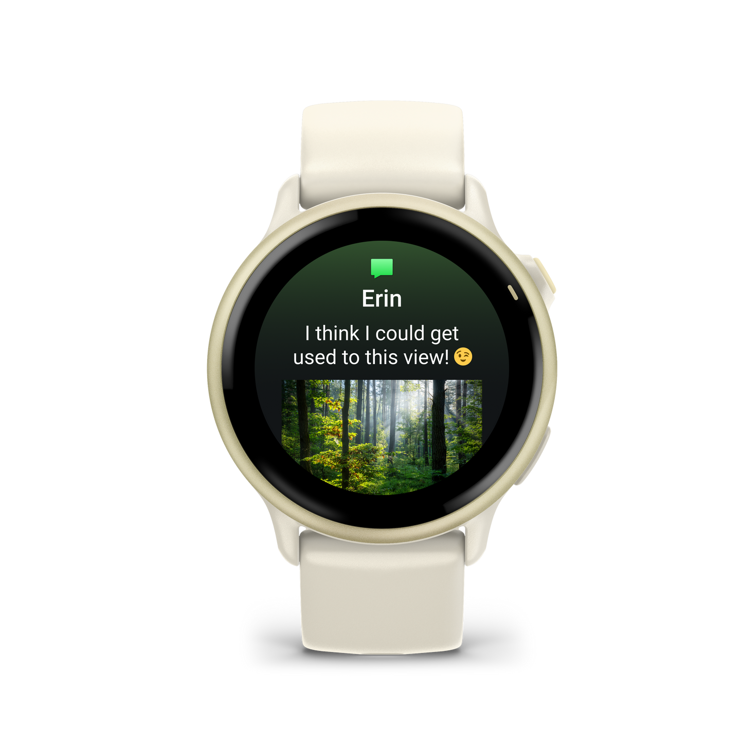 Recibe correos electrónicos, mensajes de texto y alertas en el reloj cuando esté vinculado a un smartphone Android o iPhone. Con un teléfono Android, podrás responder a los mensajes de texto con el teclado del reloj y ver las fotos recibidas directamente en la pantalla del reloj.